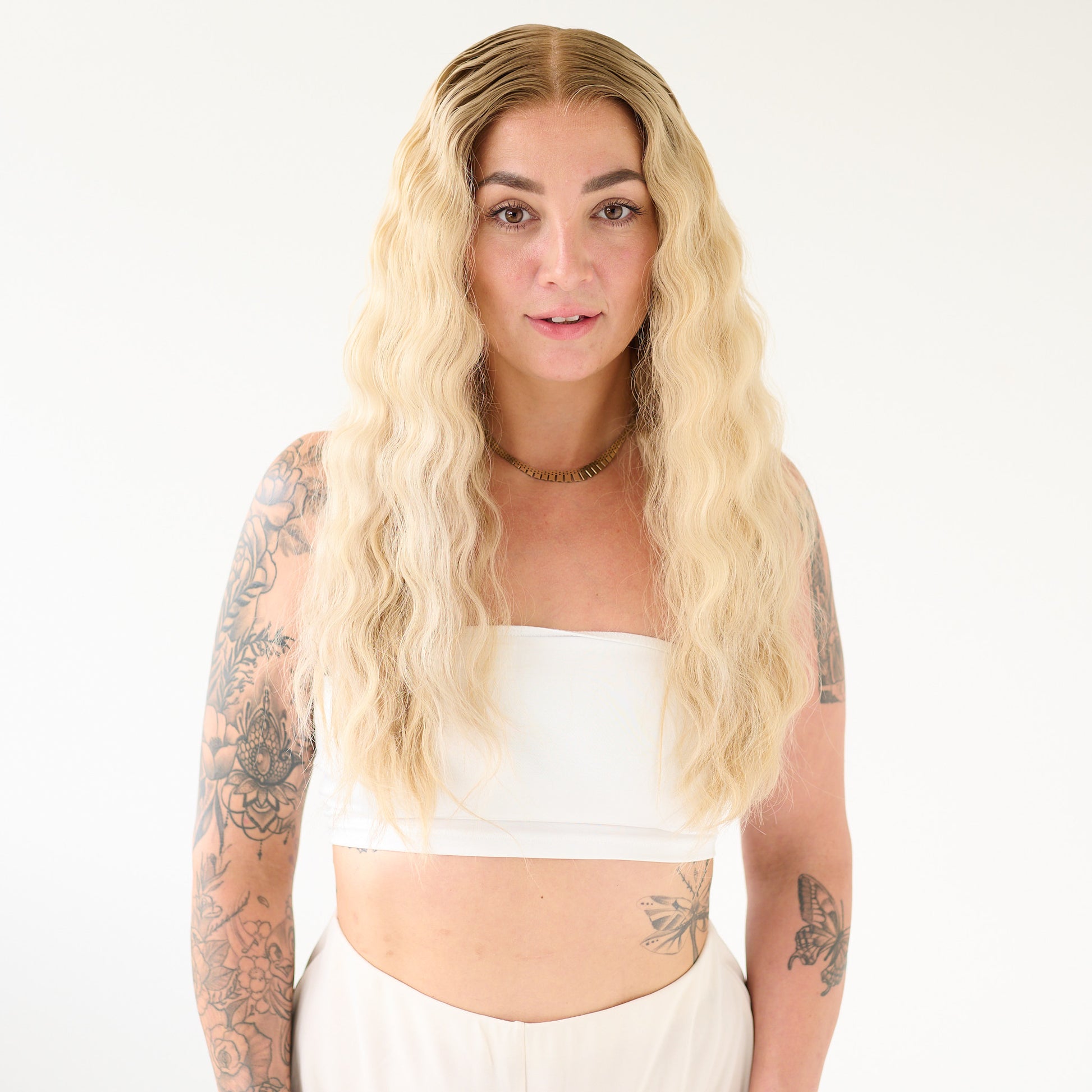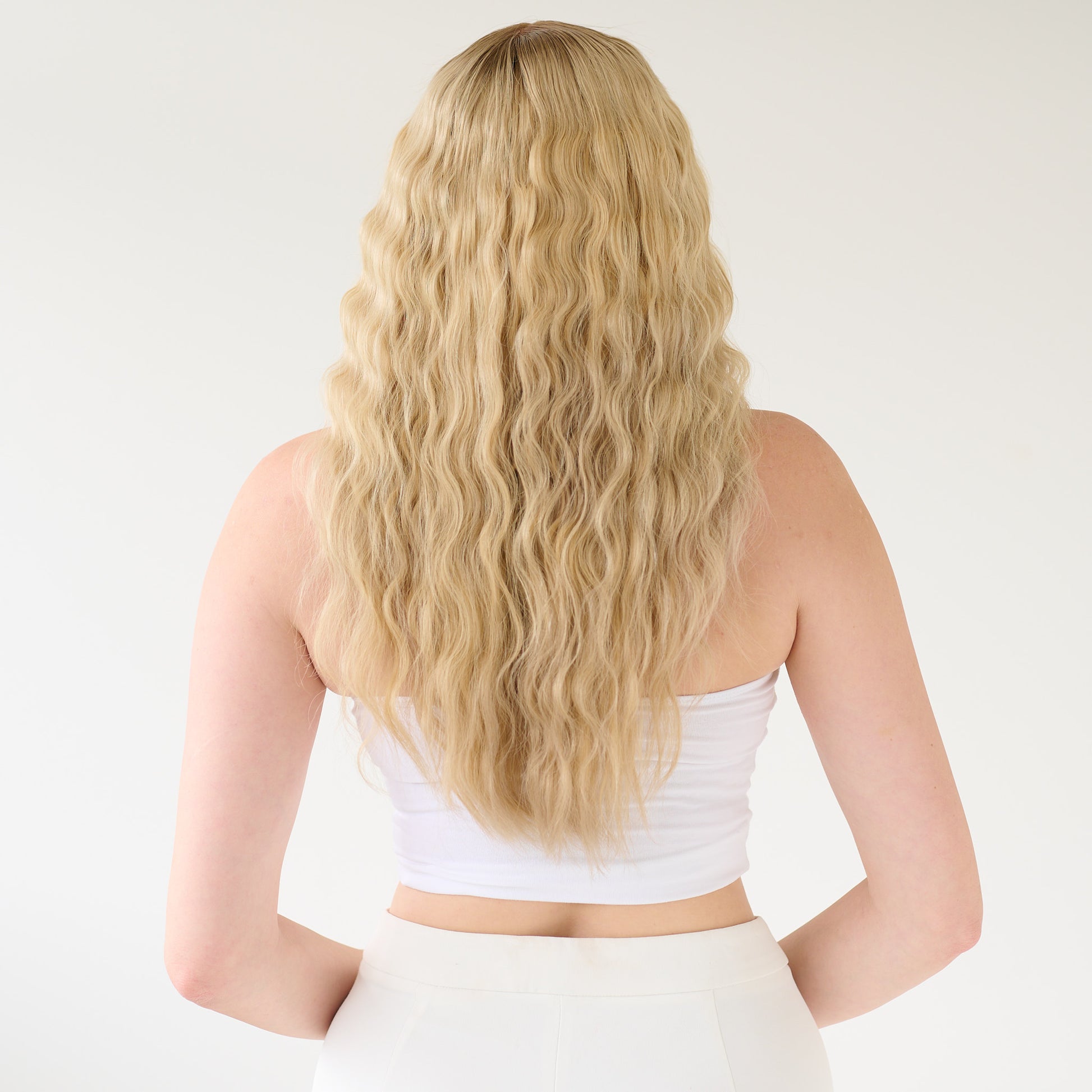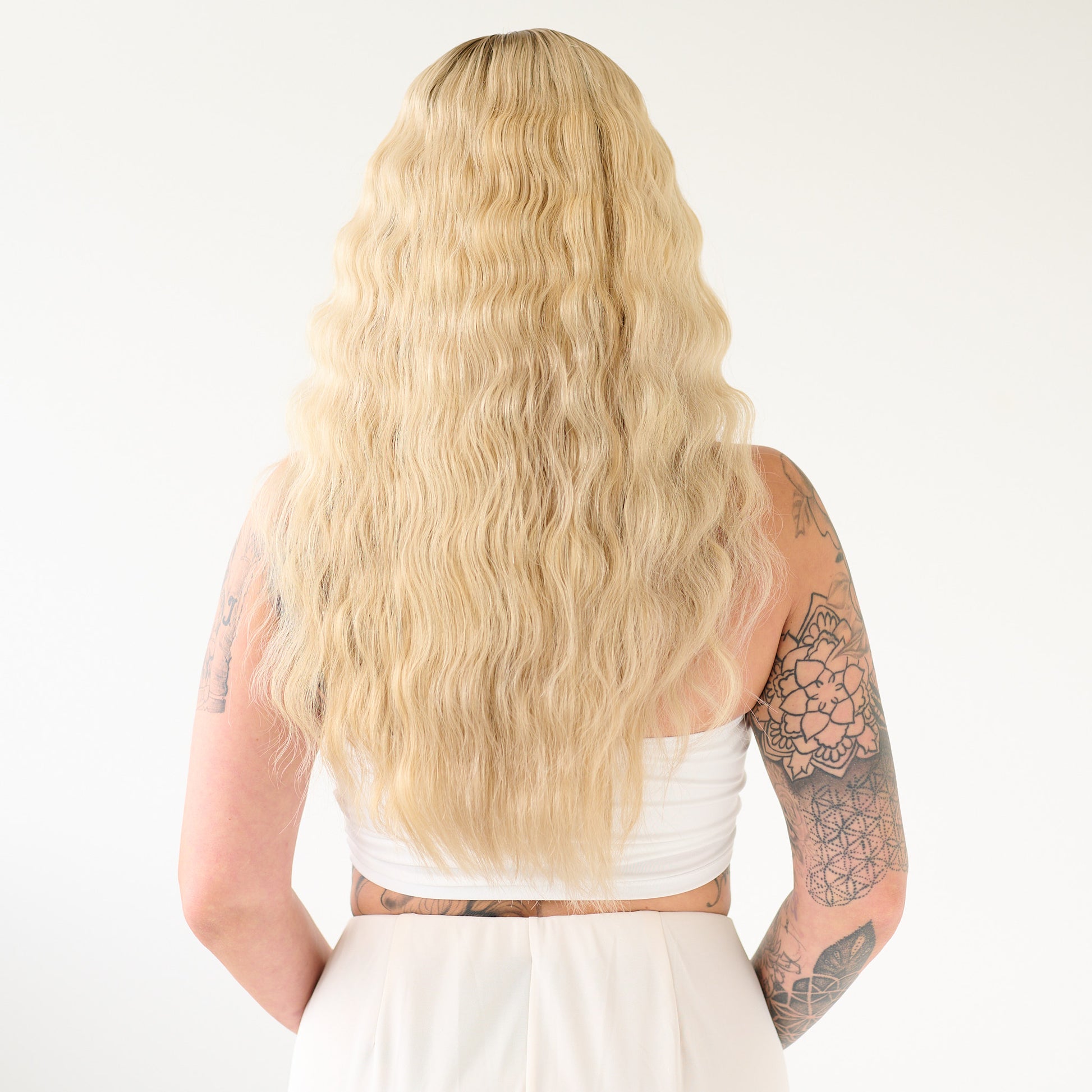 She comes with the most breathtaking dark roots and cold light blonde lengths.
